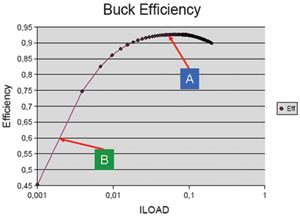 图1显示在A点可达到95%的效率,在B点却只能达到60%甚至更低的效率。对于便携式消费产品,操作点或负载标尺上的这种差异将非常重要,因为大部分这些电子器件都有多种功能(如播放音乐、拍照或拨打电话),每种功能都要求一个不同的操作点或不同的DC-DC调节器有效负载。对于那些用户未调用的功能,DC-DC源的功率负载会非常轻,95%的效率将会锐减为50%甚至更低,因为是在图1中的B点。